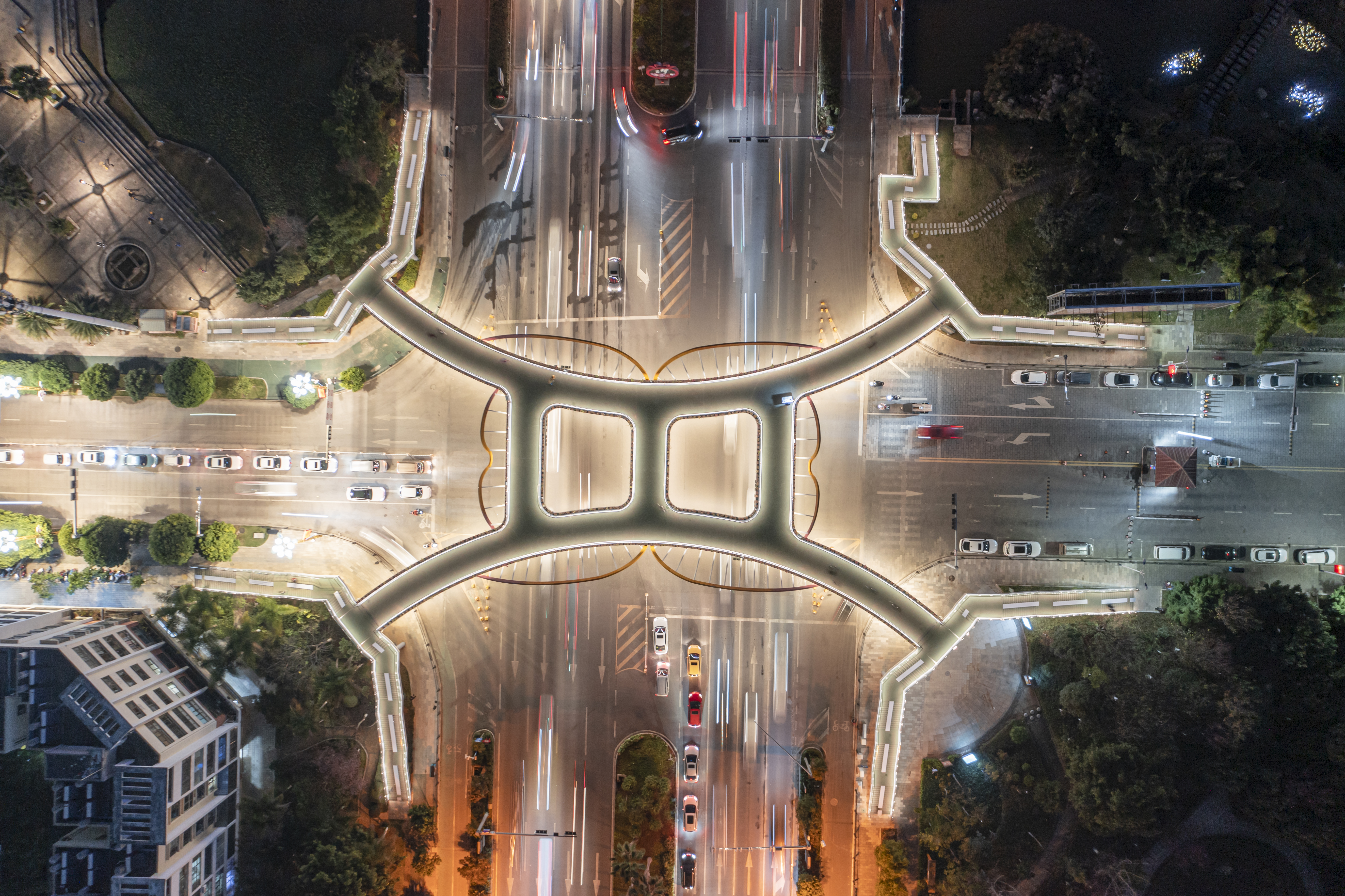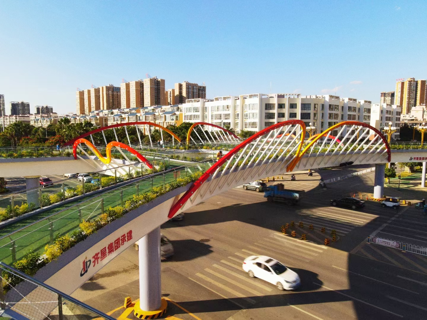 兩座天橋分別位于紅河大道與學(xué)海路交叉口,紅河大道與鳳凰路交叉口處,為人群安全過街而設(shè),人行過街天橋。主橋橋跨布置分別為15+46+15m,24+46+15m,都為雙幅布置,結(jié)構(gòu)體系為連續(xù)鋼箱梁橋(鋼構(gòu)),橋下凈空6m,主橋橋面寬4m,梯道橋面寬3m,做到了人車分離,很大程度上解決了過街交通隱患,切實(shí)保證了行人出行安全,是一項(xiàng)便民惠民的工程。